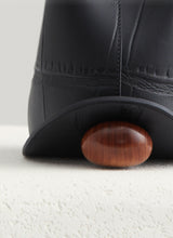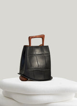Crafted with croco embossed leather and wood. Includes a zipped inner pouch and an adjustable shoulder strap.