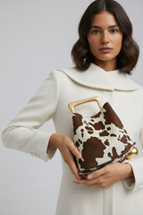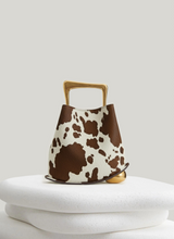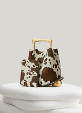 Our signature design, the Iconic Ozzy Bag, now reimagined with cow print and gold metal details.