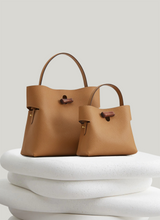 Gaia is our interpretation of the classic carryall with a modern twist, designed with a wooden centerpiece closure.